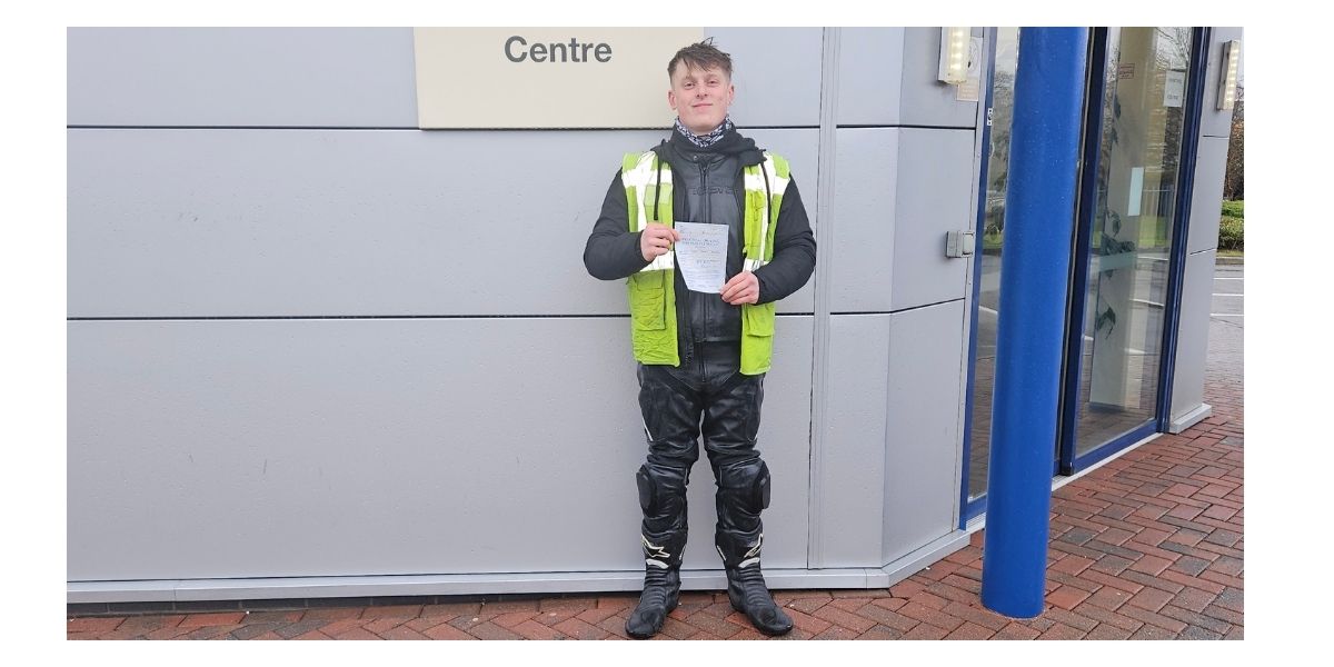 Tom came to us in March 2023 for a CBT, then onto his A2 with us in the October, which he nailed first time, so he’d set himself a high bar for when he came back yesterday for a recap, but this time on the DAS bike. Not to let himself down, nor to let the torrential rain deter his perfect pass today though, so well done Tom, from that CBT on an auto to a full DAS licence today – now you can go home and get dry before the celebrations begin!